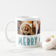 Moderna Tipografia de Natal Merry Foto Colagem de Café Mug. Esta caneca de Natal moderna e simples vem com um texto Feliz de Natal em tipografia de tendências e três imagens de colagem - insira suas fotos favoritas na modelo. Excelente ideia para um presente de Natal pessoal para seus amigos e família.