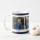 O café de Natal ou caneca de cacau quente apresenta três (3) fotos de feriado favoritas e a sua escolha de texto personalizado. O design padrão inclui fotos de dois irmãos, seus nomes e uma foto junto com o ano. Design apresenta um marinho azul clássico, verde-caçador e borda de xadrez de tartã escocesa vermelha com um fundo branco nítido para destacar suas fotos. Crédito da fotografia: Livia Plaskey Photoographic @liviaplaskeyphotoographic