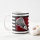 Caneca de lacrosse única com arte de palitos de lax em fundo de marrom com listras pretas e brancas. Para personalizar, edite texto para adicionar o nome do jogador de lacrosse.