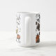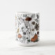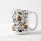 Esta elegante caneca do outono apresenta ilustrações desenhadas à mão a tinta preta, apresentando uma cena da Colheita da Queda Ocidental com crânios de vaca, rosas, abóboras, folhas de outono, ramos e bagas, tudo com um elegante esquema de cores de queda. Fundo branco.