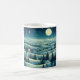 Uma paisagem de fantasia pacífica de inverno de neve cobria colinas rolantes, lua de cheio e um céu estrelado.