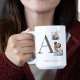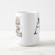 The Collaged Initial Stories coffee mug blends modern design with sentiment. A large charcoal serif initial anchors one square and one rectangular photo stacked nearby, accented with washi tape details. Names and location in charcoal text rest below on a clean white base.