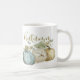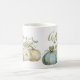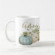 As belas abóboras de aquarela em tons de azul macio e marrom em fundo branco são apresentadas nesta clássica caneca de café. A palavra "Outono" está escrita por cima em toda a caneca. Coordena-se com os outros designs da Coleção de Abóbora Azul de outono do Compro de Algodão da Vintage Mama.