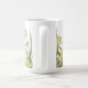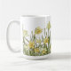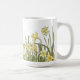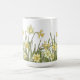 Caneca de café com borda floral de daffodilos amarelos sobre fundo branco.