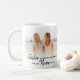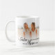 Esta elegante caneca de café com foto será um presente maravilhoso para qualquer irmã ou irmãs neste Natal, aniversário ou outra ocasião especial. A maneira moderna de exibir suas fotografias mais preciosas, esta apresenta uma foto com uma citação que diz 'Uma irmã é um pouco da infância que nunca pode ser perdido.' personalizado com seus nomes na parte inferior sobre uma sobreposição branca desbotada.