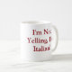 Caneca de café branco com borda verde e punho com italiano dizendo "que eu não estou gritando, eu sou italiano"