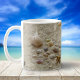 Esta caneca é perfeita para amantes de praia e de concha, e mostra uma foto de uma variedade de conchas bonitas aninhadas na areia da praia.