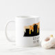 Design de caneca de café apresenta a silhueta de linha do horizonte da cidade de Atlanta Georgia com a cor do pôr do sol e as coordenadas do mapa de latitude e longitude
