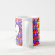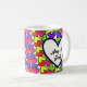Corações coloridos brilhantes e dois nomes numa caneca de café fofa.