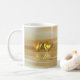 Uma caneca de café com o meu design original de uma cena ouro e amarela com os corações ouros flutuando na água. O texto personalizável diz "50 Anos".