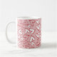 Corações vermelhos e brancos espalhados em um fundo rosa.