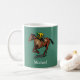 Presentes esportivos e acessórios para fãs da Corrida dos Cavalos. Corrida de cavalos e jóquei em camisa amarela e cavalo de boné verde número 7. Fundo verde.