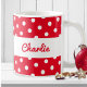 Uma caneca na moda vermelha e branca, com um padrão de bolinhas divertido. Personalize com o nome do destinatário, que aparecerá na tipografia vermelha na frente e no verso da design, em uma banda branca ao redor da caneca.