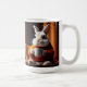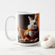 Esta caneca de café apresenta um coelho confortável a tomar café matinal.