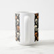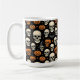 Crânios de laranja e marfim, intercalados com jack o'lanternas, morcegos e estrelas se combinam para fazer uma caneca de café engraçada e fofa para o Halloween.