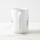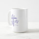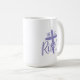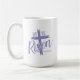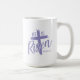 A caneca de café é mostrada em roxo e branco com uma impressão Ele Ressuscitou.