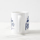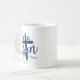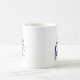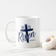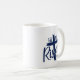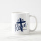 A caneca de café é mostrada em azul-marinho e branco com uma impressão Ele Ressuscitou.
