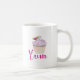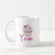 Uma caneca com o texto Yum! Projetado com uma ilustração de um cupcake alegre com espirais cor-de-rosa e uma baga com folhas aninhadas no glacé.