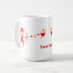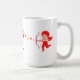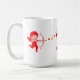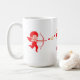Cupido de desenho animado vibrante com asas, um vestido vermelho e um arco voa através de um fundo vermelho cheio de corações. Perfeito para projetos temáticos de Dia dos Namorados, romance e família.