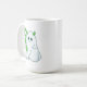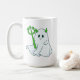 This is a cartoon illustration of a ghost character. The ghost is white with a dark outline, featuring two small green horns on its head. It has black, oval-shaped eyes and a small, upturned mouth. The ghost is holding a green trident with three prongs in its right hand. The background is a solid light gray color.