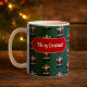 Santa Claus on a Christmas mug. Use "Personalize this template" to change the "Merry Christmas!" text and create a unique, customized gift; text changes are reflected on both sides. Enjoy a warming hot chocolate at Christmas in this mug, featuring a busy repeat of Father Christmas doing a star jump. Drawn in a retro, pixel art style, a traditional Santa Claus decked in red suit and hat with white fur trim, black boots and belt with a gold buckle, brown mittens and a fluffy white beard.