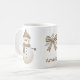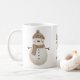 Cute Snowman Bow Drawing Name Christmas Coffee Mug. Cozy, boho-inspired Christmas mug featuring cute drawing of a snowmen and a festive Christmas bow. Soft earthy tones such as terracotta, cream, and green. The overall aesthetic exudes a warm, rustic, and modern Bohemian feel, perfect for a stylish yet festive holiday look.