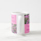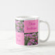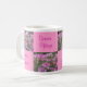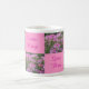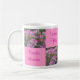 Esta caneca de café é checkered com uma foto de flores de aranha, alternando com a escrita cor-de-rosa em um fundo cor-de-rosa mais claro, dando o nome da flor em Latin, em inglês, o alemão e o sueco.
