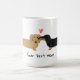 Uma caneca de café de um amante de cachorro. Doxie preto e bronzeado e casaco Dachshund vermelho liso com coração. Uma ilustração humorística do beijo de um cão-solteiro. Esta caneca divertida faz um presente perfeito para alguém que você ama. Um desenho animado original para cães da semana por ©Jenn Inashvili. Visite o Doodle World de Jenn para ver ainda mais desenhos animados de raças caninas e presentes do amante de Dachshund.