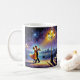 Isso captura a cena romântica de um casal dançando sob o poste com o pano de fundo da cidade.