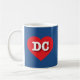 Esta caneca apresenta um coração vermelho vibrante contendo as letras maiúsculas, brancas e em negrito DC, a abreviatura oficial do Distrito de Colúmbia.