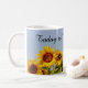 Esta caneca de café inspiradora e edificante apresenta um jardim de girassóis amarelos e as palavras "Hoje é o seu dia". É um ótimo presente para alguém que precisa de "incentivo"