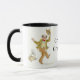 Uma caneca de café branco com uma borda e um punho pretos, decorados com um homem idoso, dançando à música de um gramofone velho, de uma pintura do watercolour por Judy Adamson. O texto, na rotulação preta, que você pode mudar, é "vovô Groovy!". Este design está igualmente disponível em cartões e em imãs de geladeira.