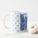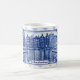 Coffee mug in a Delft Blue style with an image of Amsterdam. Generative content with photography by Velvet Escape.