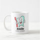 Uma caneca com uma ilustração de um estilo de desenho animado, grande dente branco sorrindo alegremente segurando uma escova de dente vermelha e dando aos polegares uma placa para cima.
