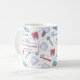 Uma caneca com um padrão temático dental. Apresentando ilustrações coloridas de dentes, escovas de dentes e várias ferramentas dentárias.