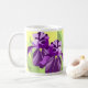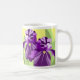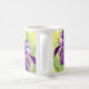 Arte floral moderna de íris roxa com fundo amarelo em canecas de café