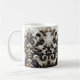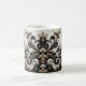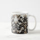 Esta caneca de café tem dois tamanhos. Um é 11oz. o outro é 15oz. Tem uma decoração de folhagem de mármore preto e branco.