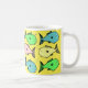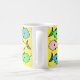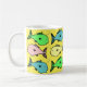 Design de peixe tropical. Uma caneca desenhada atraente, decorada com um padrão de peixe colorido. Ideia para um dono de peixe tropical. Fundo amarelo.