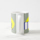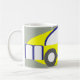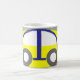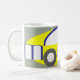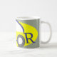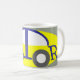 Uma caneca para o entusiasta do carro. Design de um carro abstrato formado pelas letras da palavra "motor". O motivo é impresso em cinza amarela e preto.