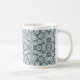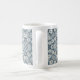Esta caneca de café tem um tipo de fundo cinza com designs florais brancos.