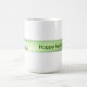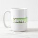 Caneca branca com frango-mãe e pintinhos seguindo junto