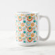 Esta caneca tem uma design moderna do século médio de círculos concêntricos em ouro, laranja e turquesa sobre fundo branco.