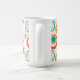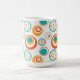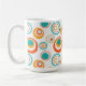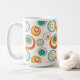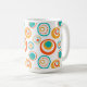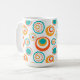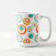 Esta caneca tem um design moderno do século médio de grandes círculos concêntricos em ouro, laranja e turquesa sobre fundo branco.