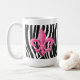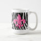 Caneca de café no teste padrão preto & branco sassy, popular da zebra. Impresso com uma flor de lis do rosa quente.