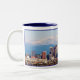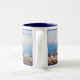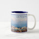 Caneca de café com panorama da Los Angeles do centro com as montanhas neve-tampadas de San Gabriel no fundo.