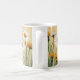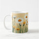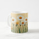 Uma borda de margaridas brancas e flores amarelas menores em um fundo bronzeado faz uma caneca doce que você vai amar!