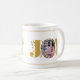 Dourada Alegria com bagas, caneca de café com foto de Natal. Mostra a palavra "JOY" em ouro com bagas vermelhas e verde enquanto em vez da letra "O" está a sua foto.