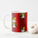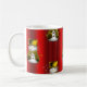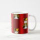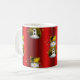 Uma linda caneca de Natal com um padrão de boneco de neve vestido de chapéu de veludo de ouro e colete em um fundo vermelho colorido para dar a sua casa um verdadeiro olhar de Natal nesta temporada de férias.