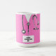 Apreciação por um médico criativo, caneca de presente de aniversário ou de graduação, com esfregões de hospital cor-de-rosa e ilustração com etiqueta de identificação. Para personalizar editar texto para adicionar nome.
