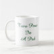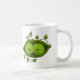 Uma ilustração branca de duas ervilhas verdes de desenho animado com rostos sorridentes em uma cápsula verde. Por cima e por baixo da cápsula estão as vinhas com folhas verdes. Do outro lado da caneca em texto verde estão as palavras "Duas Ervilhas em Um Pod"